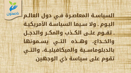 السياسة المعاصرة في دول العالم اليوم ـ ولا سيما السياسة الأمريكية ـ تقوم على الكذب والمكر والدجل والخداع، وهذه التي يسمونها بالدبلوماسية والميكافيلية، والتي تقوم على سياسة ذي الوجهين.